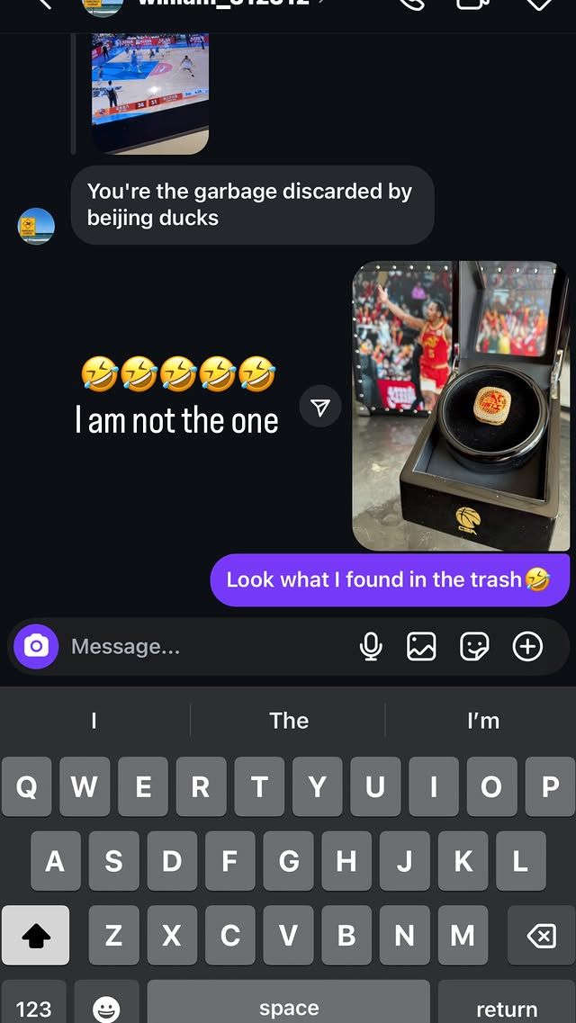 然而北京球迷卻對(duì)布朗這位昔日球隊(duì)舊將并不友好,今日布朗在社交媒體上曬出一張私信截圖,一位球迷發(fā)給了布朗一段文字,直言布朗是北京首鋼霹靂鴨不要的垃圾。